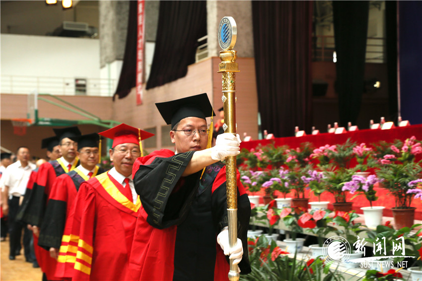 伴著激昂的旋律,校領(lǐng)導(dǎo)及學(xué)位評(píng)定委員會(huì)委員在陜西科技大學(xué)權(quán)杖的引領(lǐng)下緩步邁入文體館,拉開了2016屆畢業(yè)典禮暨2016年學(xué)位授予儀式的序幕。