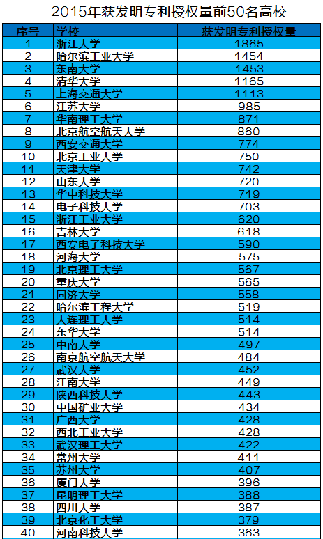 2015年高校獲發(fā)明專利授權(quán)量前50名:http://www.cutech.edu.cn/cn/zscq/2016/02/1455730697834009.htm