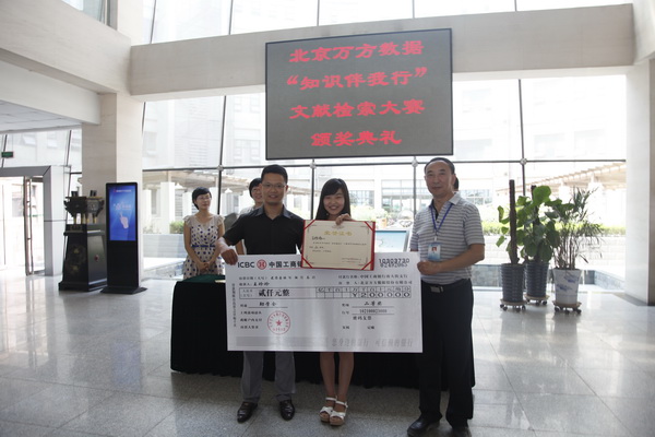 由北京萬方數(shù)據(jù)公司籌辦、陜西省各高校圖書館協(xié)辦的“知識(shí)伴我行”文獻(xiàn)檢索大賽,首次在陜西省舉行。大賽旨在提高學(xué)生的數(shù)據(jù)庫資源檢索和應(yīng)用能力,激發(fā)學(xué)習(xí)與應(yīng)用資源的熱情共設(shè)特等獎(jiǎng)1名,一等獎(jiǎng)2名,二等獎(jiǎng)18名,三等獎(jiǎng)30名,優(yōu)勝獎(jiǎng)100名。