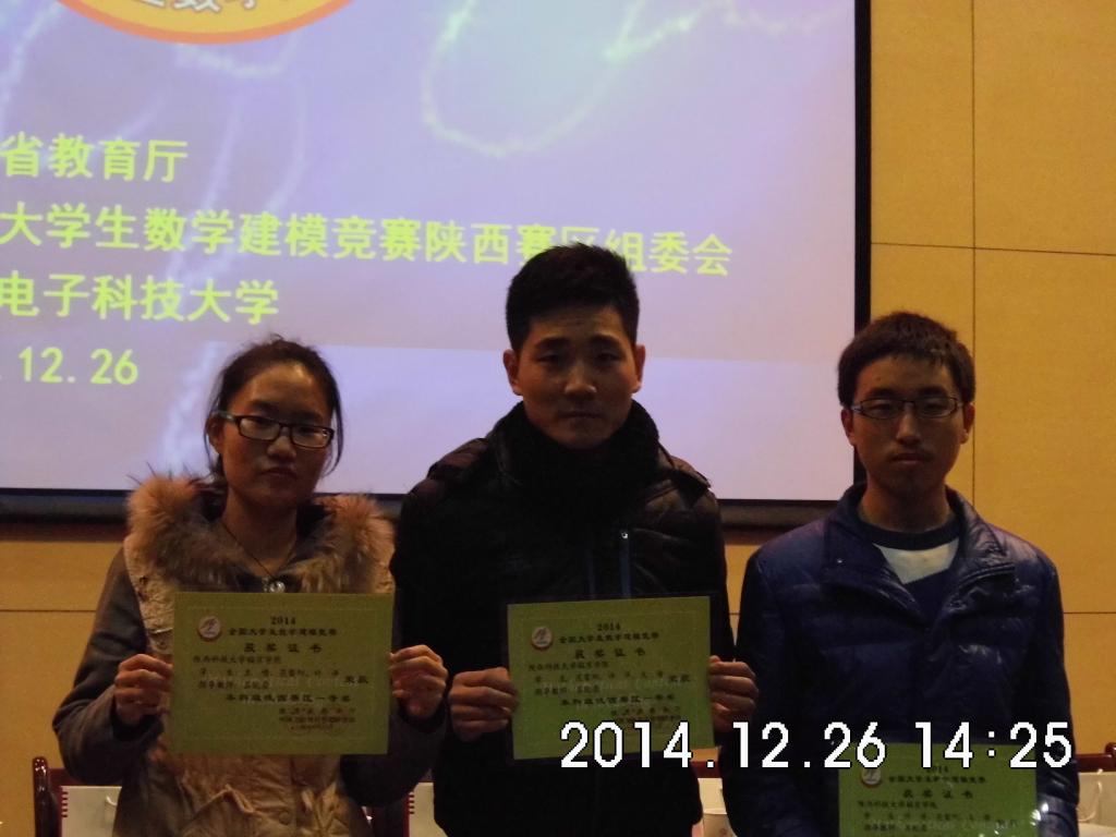 2014年學(xué)院首次組織學(xué)生參加全國大學(xué)生數(shù)學(xué)建模競賽和數(shù)學(xué)競賽,隊(duì)員主要從高數(shù)基地班中選拔,共12名學(xué)生組成4支隊(duì)伍參加建模競賽,239名同學(xué)參加數(shù)學(xué)競賽,并統(tǒng)籌聘請陜西科技大學(xué)的優(yōu)秀建模教練組和學(xué)院的優(yōu)秀青年教師對參賽學(xué)生進(jìn)行暑期集中培訓(xùn)、輔導(dǎo)及后期強(qiáng)化訓(xùn)練。歷經(jīng)1個多月緊張學(xué)習(xí),同學(xué)們同心協(xié)力、團(tuán)結(jié)拼搏、不畏困難,最終取得了優(yōu)異的成績,為學(xué)院贏得了榮譽(yù)。
