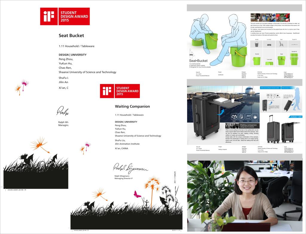 2015德國IF學生設計競賽獲獎結果公布,我校設計與藝術學院2013級設計學研究生胡宇坤作為第一設計人、與實習單位共同完成的兩項作品《Seat Bucket》、《Waiting Companion》從全球近12000件學生概念作品中脫穎而出,喜獲“2015年IF學生設計獎”。