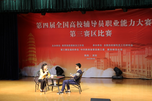 在剛剛落幕的第四屆全國(guó)高校輔導(dǎo)員職業(yè)能力大賽復(fù)賽第三賽區(qū)比賽上,我校輔導(dǎo)員再傳捷報(bào):李鵬、劉倩繼榮獲第三屆陜西省高校輔導(dǎo)員職業(yè)能力大賽一等獎(jiǎng)后,再接再厲,力克群雄,分別以第一名和第三名的成績(jī)榮獲本賽區(qū)一等獎(jiǎng),雙雙挺進(jìn)全國(guó)總決賽。