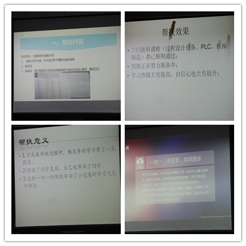 “一對(duì)一結(jié)對(duì)幫扶”活動(dòng)第二階段中期檢查答辯會(huì)于五月尾召開。學(xué)院全體學(xué)生黨員就近期結(jié)對(duì)幫扶進(jìn)展情況以PPT的形式進(jìn)行答辯,答辯人員從幫扶內(nèi)容、幫扶效果、幫扶意義三個(gè)方面進(jìn)行闡述,著重體現(xiàn)幫扶效果。經(jīng)過兩個(gè)多月的幫扶工作,“一對(duì)一結(jié)對(duì)幫扶”活動(dòng)已初見成效。有的幫扶對(duì)象在黨員的幫扶下,圍繞英語四六級(jí)制定了適合自己的學(xué)習(xí)方案,針對(duì)薄弱環(huán)節(jié)進(jìn)行專項(xiàng)訓(xùn)練,努力提升英語綜合水平以備戰(zhàn)即將到來的等級(jí)考試;有的幫扶對(duì)象在黨員的學(xué)業(yè)指導(dǎo)下,一改過去自由散漫的生活狀態(tài),學(xué)習(xí)成績有了很大的提高,在補(bǔ)考中取得了好成績,畢業(yè)生的畢業(yè)設(shè)計(jì)也能夠較好的跟上進(jìn)度;論文及專利的撰寫是研究生具備一定科研能力的體現(xiàn),通過結(jié)對(duì)幫扶,幫扶對(duì)象在論文發(fā)表及專利申請(qǐng)上均有成果展現(xiàn),個(gè)人科研能力也得到了提升。機(jī)電學(xué)院2013級(jí)學(xué)生黨支部黨員任曉明說: “我只是在用我自身的能力去幫助周圍的同學(xué),希望自己的這種能量能夠傳遞給更多的人,如果能夠起到作用,幫助他人的同時(shí)自身價(jià)值也得到了體現(xiàn),這讓我覺得很有意義?!睅头鰧?duì)象唐鋼說:“我在黨員的幫扶下,一直督促自身改掉以前的懶惰習(xí)慣,今年的補(bǔ)考全部通過,現(xiàn)在感覺又有信心啦?!?/p>