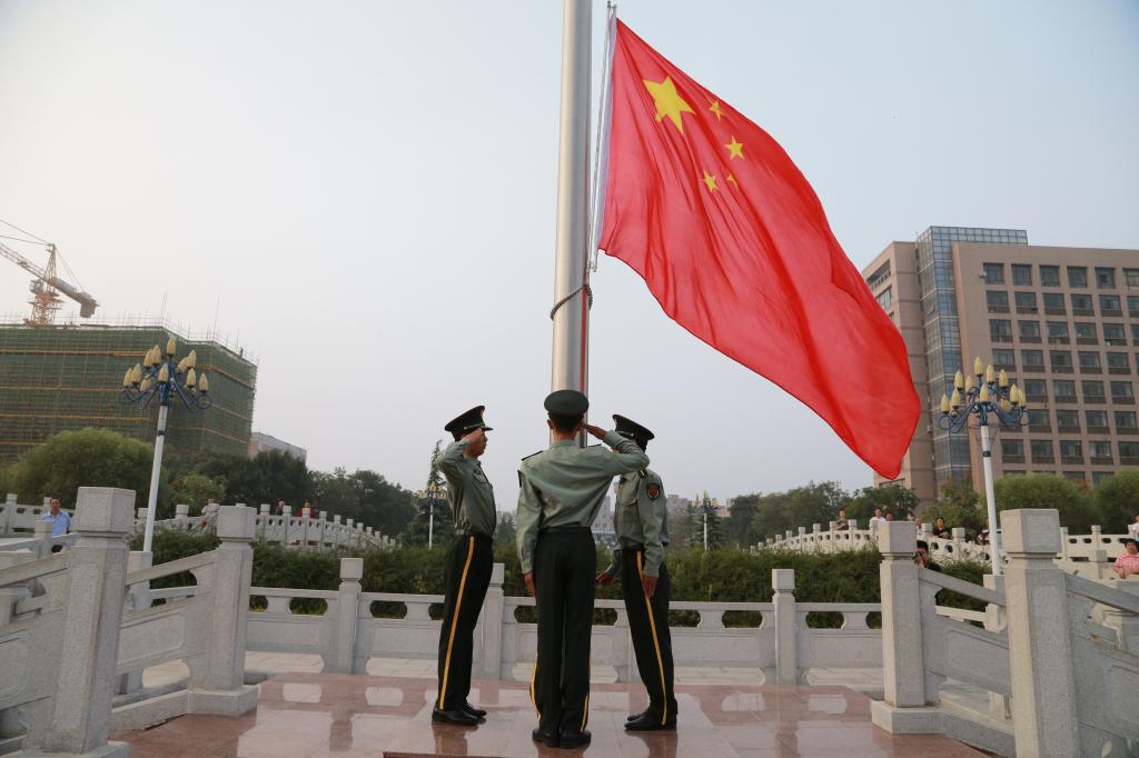 清晨7時整,圖書館南廣場莊嚴(yán)肅穆,一千多名大學(xué)生和老師肅立于此,隨著激昂的《義勇軍進行曲》奏響,升旗手振臂一揮,鮮艷的五星紅旗迎風(fēng)展開,全場師生莊重地行注目禮,同時共唱國歌。五星紅旗在雄壯的國歌聲中迎著朝陽冉冉升起,飄揚在蔚藍(lán)的天空……
