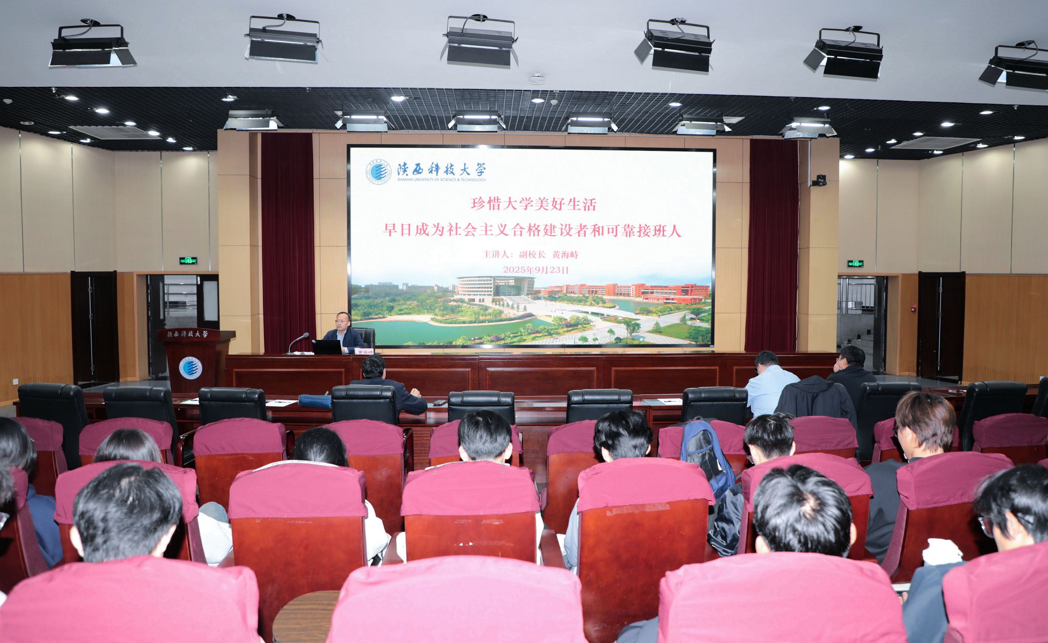 9月23日,陜西科技大學副校長黃海峙以“珍惜大學美好生活,早日成為社會主義合格建設者和可靠接班人”為題,為2025級新生講授思政課。
