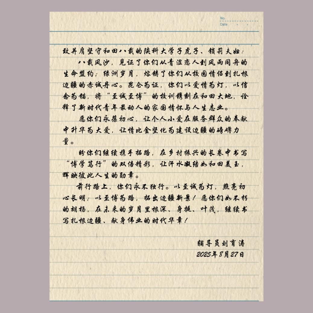 “渭水同窗,昆侖共守”,李虎與馮鎖莉的故事,未有驚天動(dòng)地的壯闊波瀾,卻蘊(yùn)藏著直抵人心的精神力量。這份力量,是伴侶間的相契與篤行——從陜西科技大學(xué)校園里的并肩求索,到和田邊疆的風(fēng)雨同舟,他們以愛(ài)為舟楫,將小家的溫情揉進(jìn)邊疆的日月,讓“相守”不再是單薄的承諾,而是浸潤(rùn)在柴米油鹽與守望相助里的具象人生;是共產(chǎn)黨人的初心與擔(dān)當(dāng)——以信念為錨點(diǎn),扎根于塔克拉瑪干沙海之畔,在走村入戶的奔波、服務(wù)鄉(xiāng)親的瑣碎里,踐行著“到祖國(guó)最需要處去”的誓言,讓“奉獻(xiàn)”脫離空泛的口號(hào),成為浸潤(rùn)在每一次解民憂、紓民困中的實(shí)在行動(dòng);更是陜科大學(xué)子的赤誠(chéng)與風(fēng)骨——攜著對(duì)土地的敬畏、對(duì)責(zé)任的恪守,將青春的印記深深鐫刻在昆侖山腳下的熱土之上,讓“成長(zhǎng)”不再是個(gè)人的踽踽獨(dú)行,而是與邊疆發(fā)展同頻共振的雙向奔赴。
