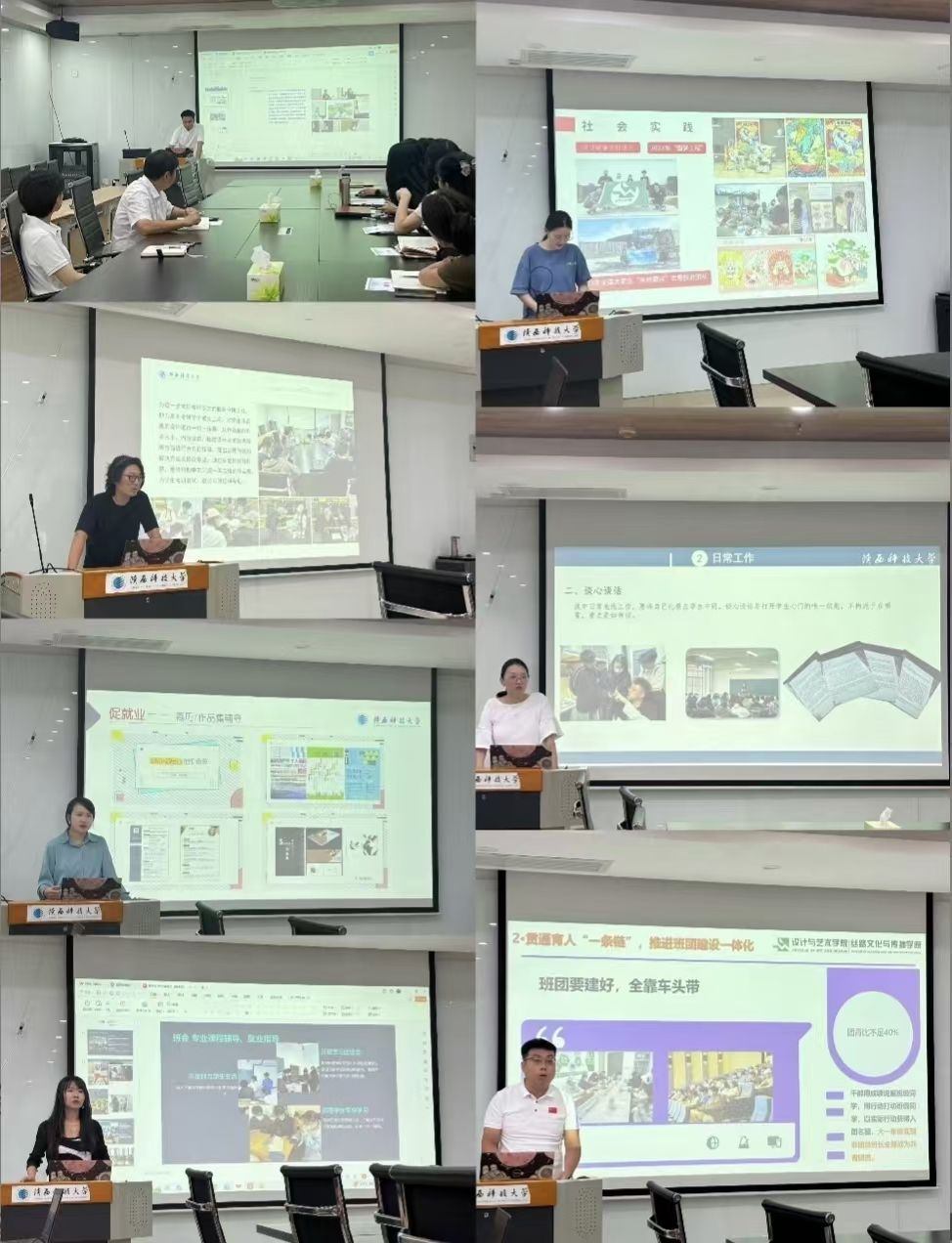 王韋策、宮凱、房琳棟、張?,摰仁芷笓?dān)任2023-2024學(xué)年青年教師輔導(dǎo)員的四位老師,匯報(bào)分享了一年以來(lái)工作開展情況及個(gè)人總結(jié)體會(huì),詳細(xì)介紹了與專職輔導(dǎo)員相互配合開展生涯規(guī)劃、作品集制作、升學(xué)就業(yè)面試輔導(dǎo)、競(jìng)賽指導(dǎo)、關(guān)懷慰問等具體內(nèi)容,從專業(yè)教師在課堂內(nèi)外開展思想政治教育工作的途徑、方法、效果及改進(jìn)進(jìn)行了充分交流。