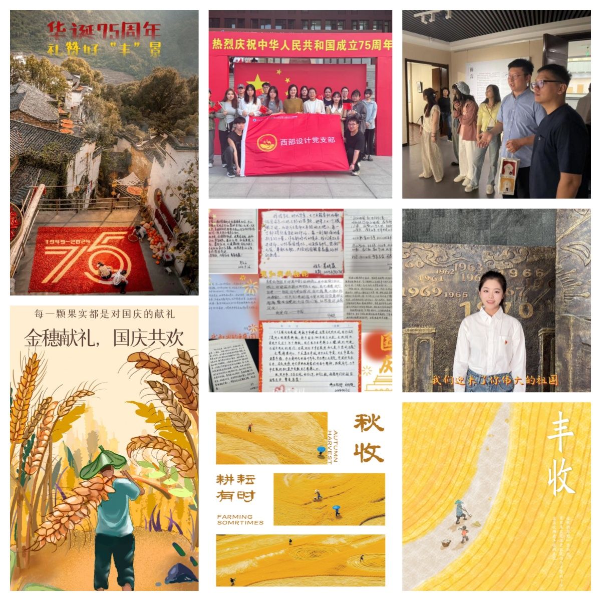 各黨支部通過海報設(shè)計、觀影、觀展、手寫信等豐富的形式開展“致敬七十五載,奮進嶄新時代”主題黨日,激發(fā)師生黨員的愛國情懷。其中,視覺傳達設(shè)計本科生黨支部以“豐收”為元素的海報創(chuàng)作傳遞了青春力量和美好祝愿,引導師生黨員將個人理想融入國家發(fā)展大勢,創(chuàng)作出更多反映時代精神、弘揚主旋律、傳遞正能量的優(yōu)秀藝術(shù)作品;西部動漫黨支部參觀了“慶祝中華人民共和國成立75周年——陜西書法作品展覽”,共同感受書法藝術(shù)的魅力,深刻體會國家發(fā)展與傳統(tǒng)文化傳承之間的緊密聯(lián)系,厚植民族自豪感。