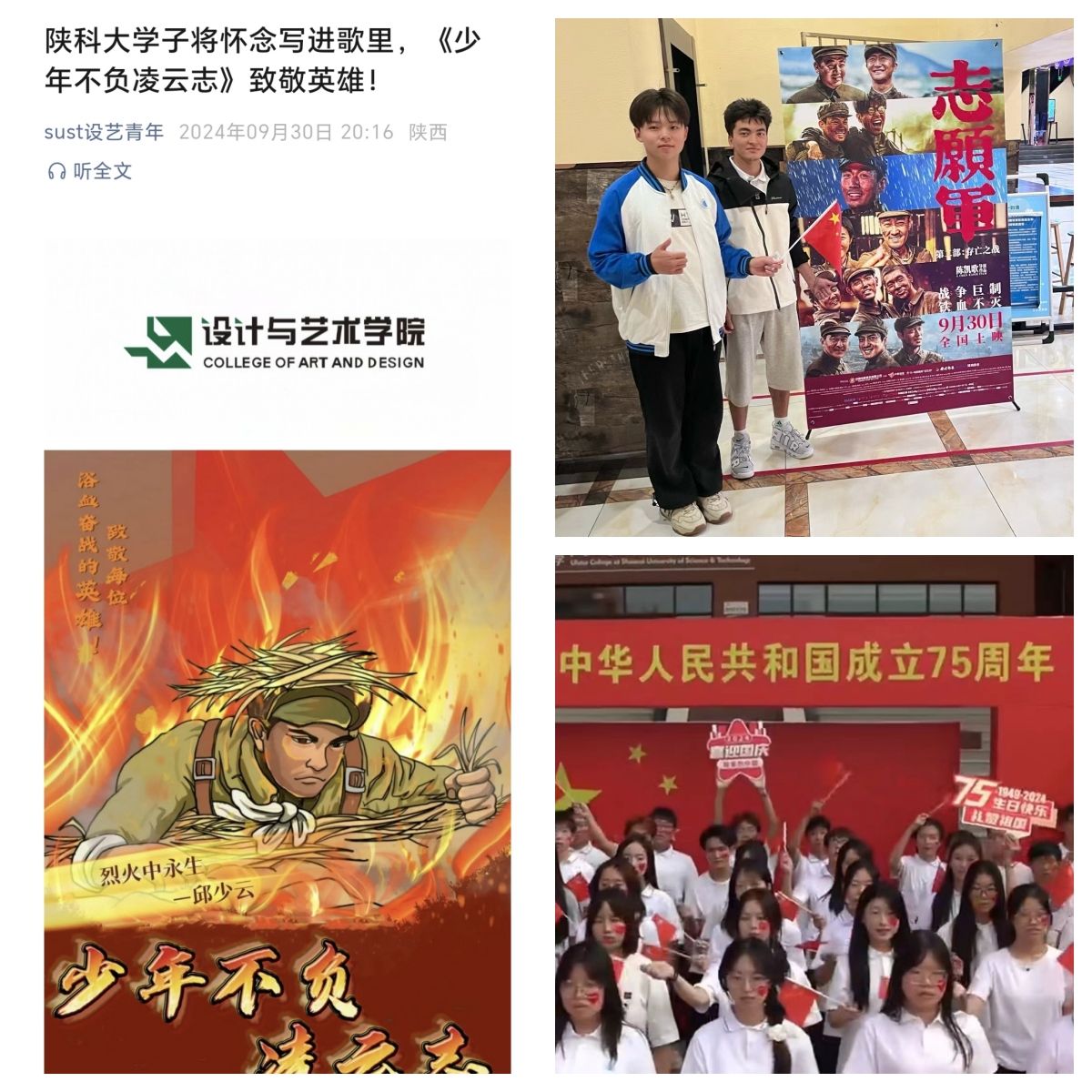 設(shè)藝學子原創(chuàng)網(wǎng)絡文化作品《少年不負凌云志》,歌曲以抗美援朝英雄邱少云的生平為創(chuàng)作脈絡,以藝術(shù)加工的第一視角,用歌聲將革命先烈的形象生動刻畫,彰顯了革命先烈不屈的堅貞與信念,表達了對革命先烈的無限敬仰對祖國的深情祝愿。