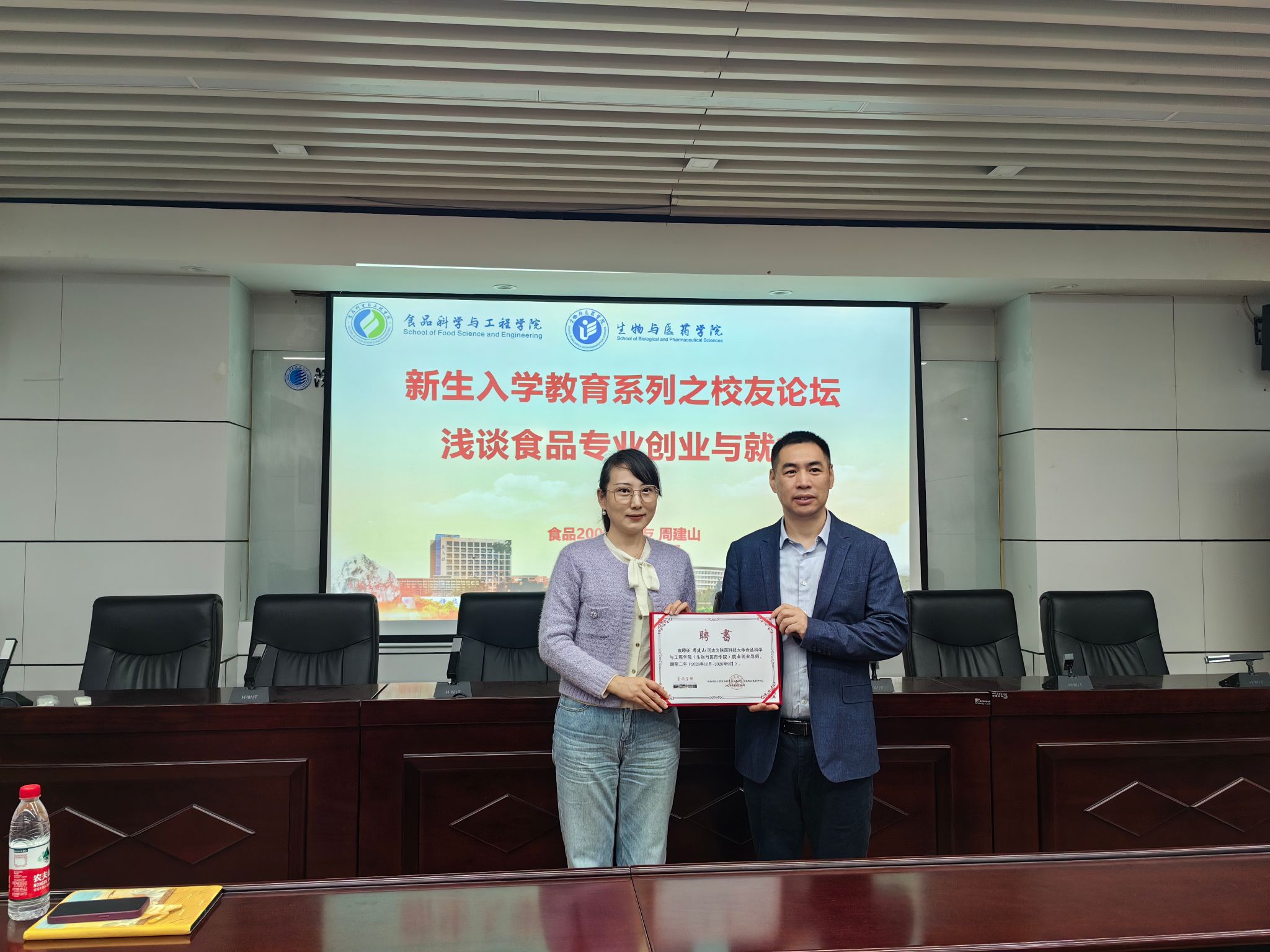活動(dòng)現(xiàn)場(chǎng),孫敏為周建山頒發(fā)食品學(xué)院就業(yè)創(chuàng)業(yè)導(dǎo)師聘任證書(shū)。