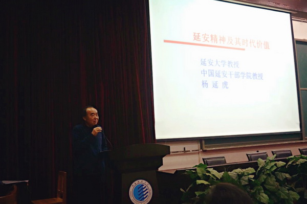 楊延虎教授從延安的地理位置講起,詳細(xì)說(shuō)明延安精神原生形態(tài):抗大精神、整風(fēng)精神、南泥灣精神、白求恩精神、張思德精神、延安縣同志們的精神和勞模精神等內(nèi)容;接著從“堅(jiān)定正確的政治方向是延安精神的靈魂”、“解放思想、實(shí)事求是延安精神的精髓”、“全心全意為人民服務(wù)是延安精神的核心”共3個(gè)方面,詳細(xì)論述了延安精神是走向共和國(guó)的精神支柱這一內(nèi)容;最后從延安精神有沒(méi)有繼承和弘揚(yáng)的資格、需要兩個(gè)方面闡述延安精神的時(shí)代價(jià)值。