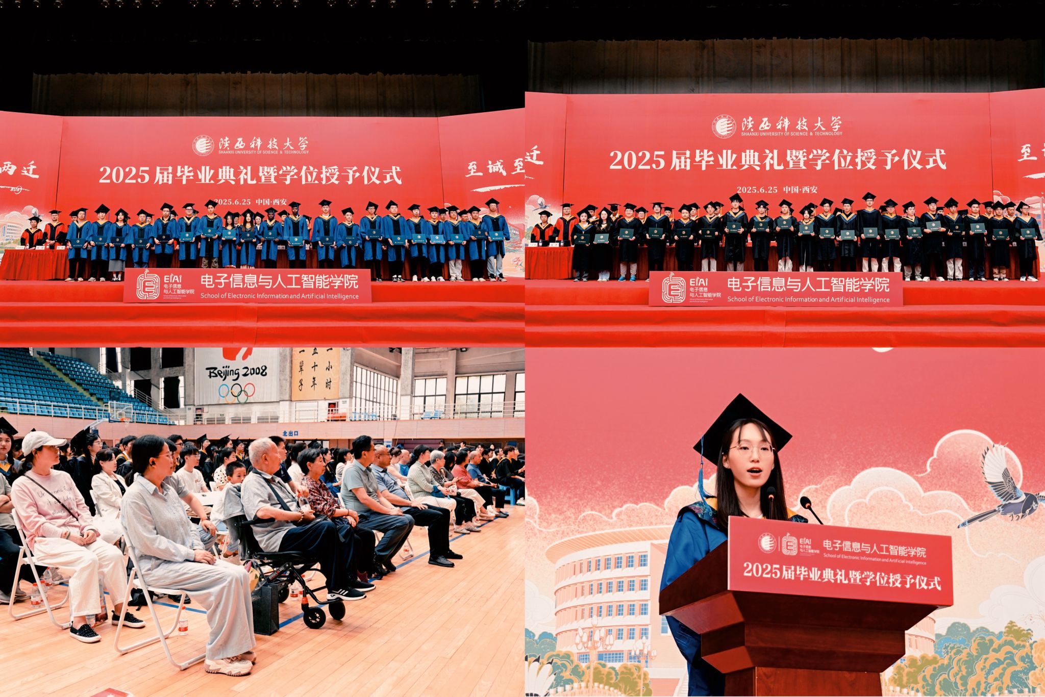 6月25日,電智學院2025屆畢業(yè)典禮于學校文體館舉行,典禮以“智青春”為主題,在師生共同見證下,院學術(shù)委員會成員為757名學子撥穗正冠。學院教師代表王曉發(fā)言,為全體2025屆畢業(yè)生送上飽含深情與期許的寄語,優(yōu)秀畢業(yè)生代表許葉彤發(fā)言暢談畢業(yè)感想,增強了全體畢業(yè)生的榮譽感與歸屬感,為他們深植“感恩”情懷。