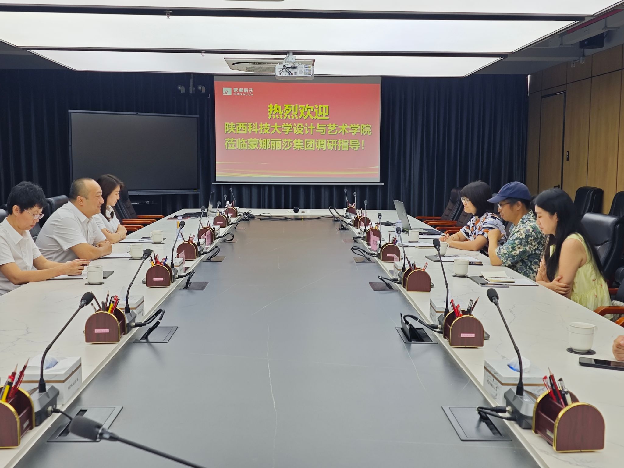 在佛山,學(xué)院一行參觀蒙娜麗莎研究院,與蒙娜麗莎集團研發(fā)中心副總經(jīng)理趙勇等就環(huán)境設(shè)計定制班建設(shè)、設(shè)計專博和博士后流動站高層次人才與科研項目合作、學(xué)生實習(xí)與畢業(yè)生招聘等進(jìn)行座談,并達(dá)成初步合作意向。