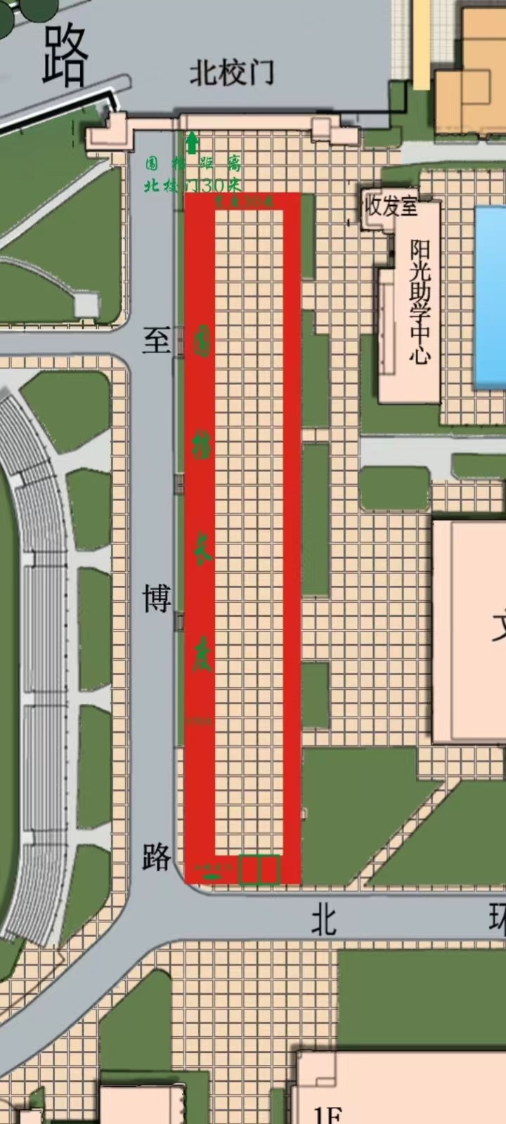 因至博文化長廊項目施工需要,自2023年5月25日起將對教學(xué)區(qū)北門以南、至博路以東、文體館以西路段,迎新大道上進(jìn)行占道封閉圍擋,敬請行人及非機動車遠(yuǎn)離圍擋區(qū)域,(施工時間為2023年5月23日至2023年8月30日)圍擋范圍如圖所示: