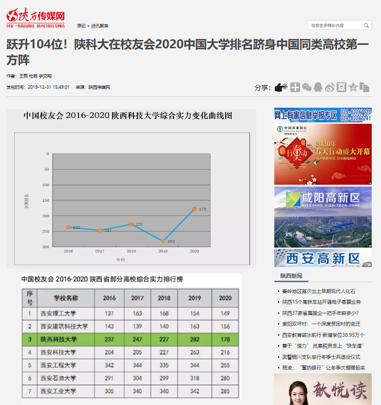近日,陜西傳媒網(wǎng)報(bào)道陜科大在校友會(huì)2020中國(guó)大學(xué)排名躋身中國(guó)同類高校第一方陣。