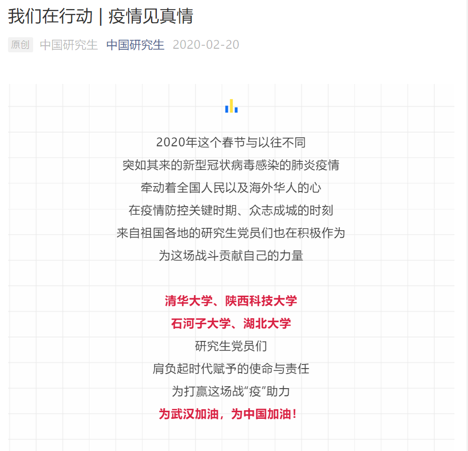 近日,中國研究生微信公眾號報道了我校研究生黨員在疫情斗爭期間肩負時代賦予的使命與責任,積極作為,為打贏這場戰(zhàn)“疫”助力,為武漢加油、為中國加油。