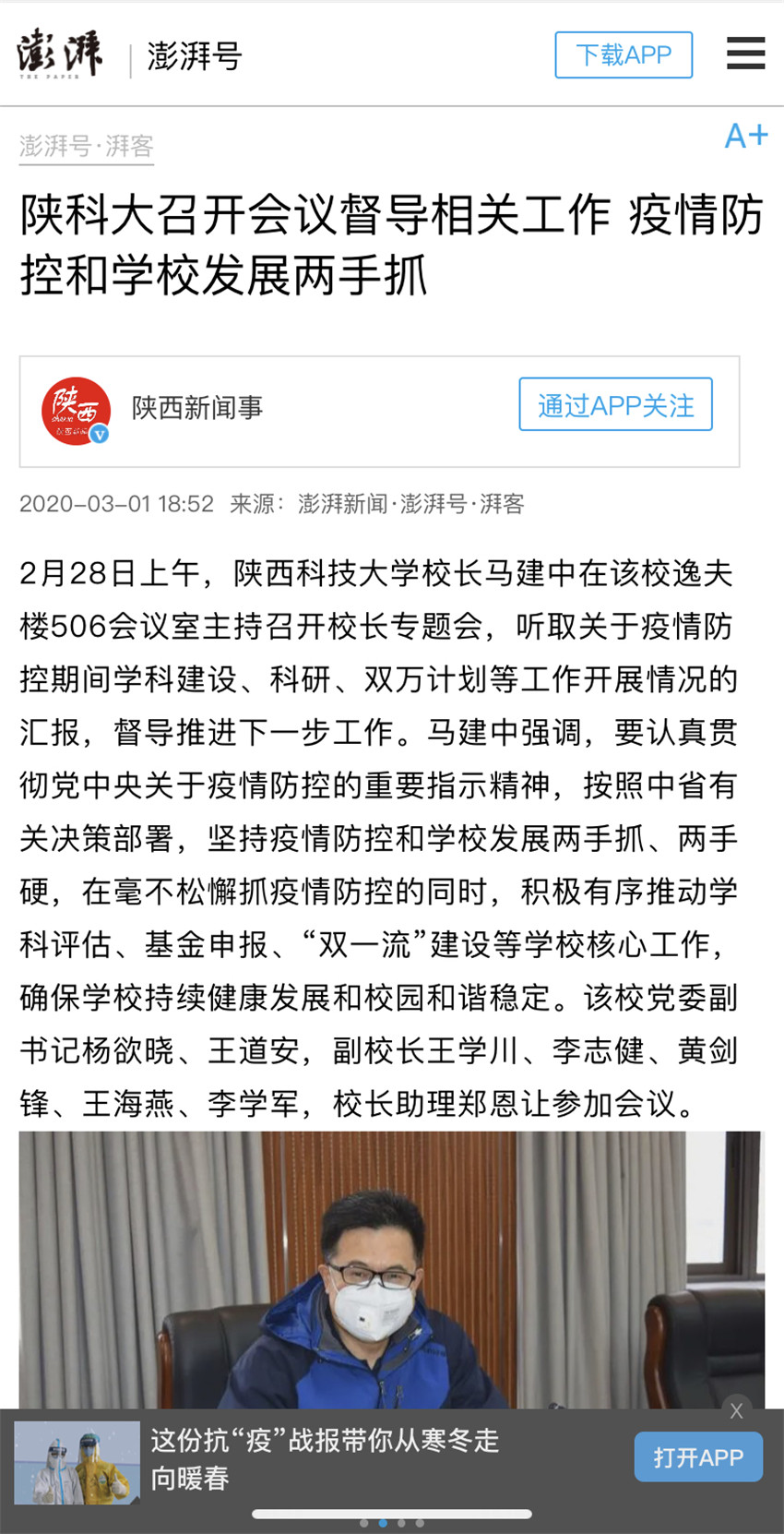 澎湃新聞客戶端:陜科大召開會議督導(dǎo)相關(guān)工作 疫情防控和學(xué)校發(fā)展兩手抓