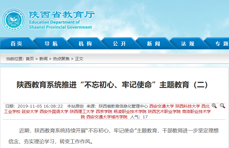 11月5日,陜西省教育廳官網(wǎng)報道了我?!安煌跣?、牢記使命”主題教育,全文鏈接如下:http://jyt.shaanxi.gov.cn/jynews/rdjj/201911/05/94330.html