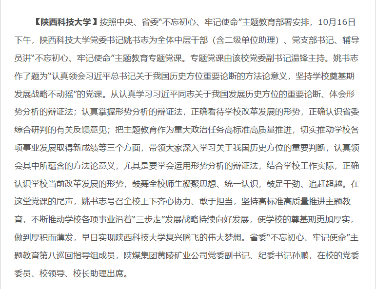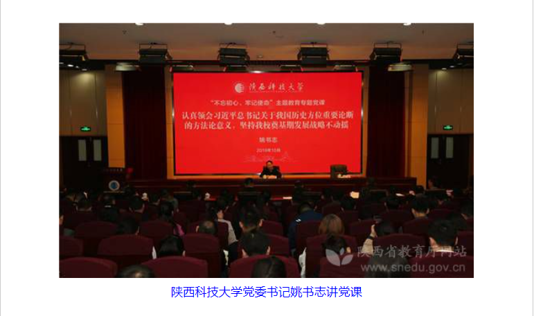 【陜西科技大學(xué)】按照中央、省委“不忘初心、牢記使命”主題教育部署安排,10月16日下午,陜西科技大學(xué)黨委書記姚書志為全體中層干部(含二級單位助理)、黨支部書記、輔導(dǎo)員講“不忘初心、牢記使命”主題教育專題黨課。專題黨課由該校黨委副書記溫鋒主持。姚書志作了題為“認真領(lǐng)會習(xí)近平總書記關(guān)于我國歷史方位重要論斷的方法論意義,堅持學(xué)校奠基期發(fā)展戰(zhàn)略不動搖”的黨課。從認真學(xué)習(xí)習(xí)近平同志關(guān)于我國發(fā)展歷史方位的重要論斷、體會形勢分析的辯證法;認真掌握形勢分析的辯證法,正確看待學(xué)校改革發(fā)展的形勢,正確認識省委綜合研判的有關(guān)反饋意見;把主題教育作為重大政治任務(wù)高標(biāo)準(zhǔn)高質(zhì)量推進,切實推動學(xué)校各項事業(yè)發(fā)展取得新成績等三個方面,帶領(lǐng)大家深入學(xué)習(xí)關(guān)于我國歷史方位的重要判斷,認真領(lǐng)會其中所蘊含的方法論意義,尤其是要學(xué)會運用形勢分析的辯證法,結(jié)合學(xué)校工作實際,正確認識學(xué)校當(dāng)前改革發(fā)展的形勢,鼓舞全校師生凝聚思想、統(tǒng)一認識,鼓足干勁、追趕超越。在這堂黨課的尾聲,姚書志號召全校上下齊心協(xié)力、敢于擔(dān)當(dāng),堅持高標(biāo)準(zhǔn)高質(zhì)量推進主題教育,不斷推動學(xué)校各項事業(yè)沿著“三步走”發(fā)展戰(zhàn)略持續(xù)向好發(fā)展,使學(xué)校的奠基期更加厚實,做到厚積而薄發(fā),早日實現(xiàn)陜西科技大學(xué)復(fù)興騰飛的偉大夢想。省委“不忘初心、牢記使命”主題教育第八巡回指導(dǎo)組成員,陜煤集團黃陵礦業(yè)公司黨委副書記、紀(jì)委書記孫鵬,在校的黨委委員、校領(lǐng)導(dǎo)、校長助理出席。