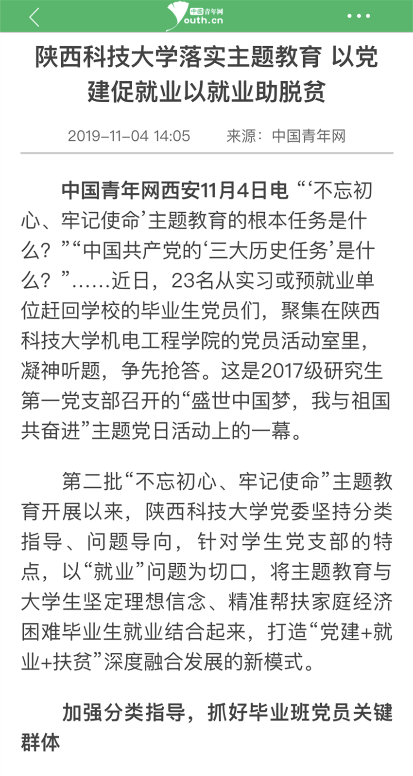 中國青年網:陜西科技大學落實主題教育 以黨建促就業(yè)以就業(yè)助脫貧