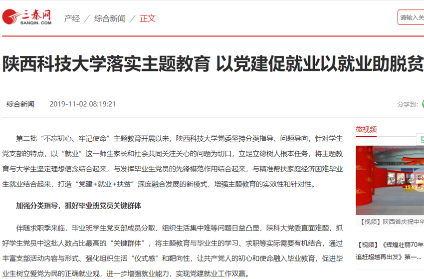 三秦網:陜西科技大學落實主題教育 以黨建促就業(yè)以就業(yè)助脫貧