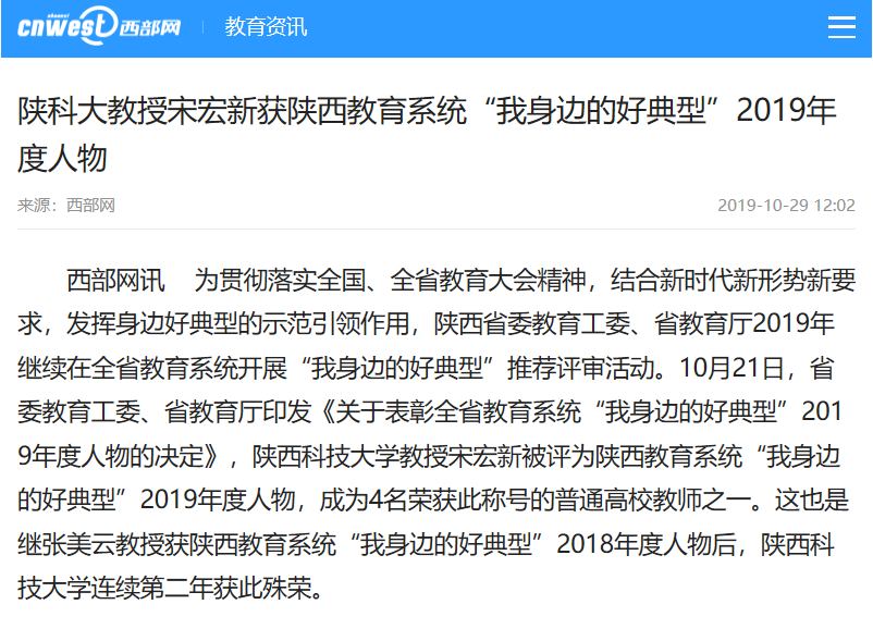 西部網(wǎng)報(bào)道:陜科大教授宋宏新獲陜西教育系統(tǒng)“我身邊的好典型”2019年度人物