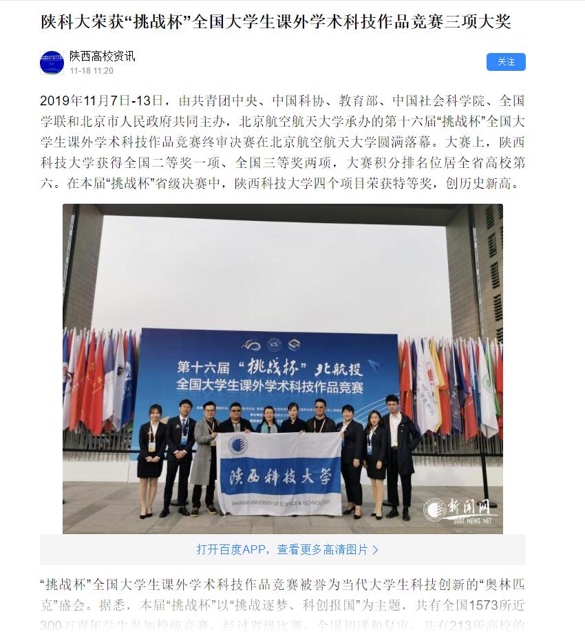百度APP:陜科大榮獲“挑戰(zhàn)杯”全國大學生課外學術(shù)科技作品競賽三項大獎