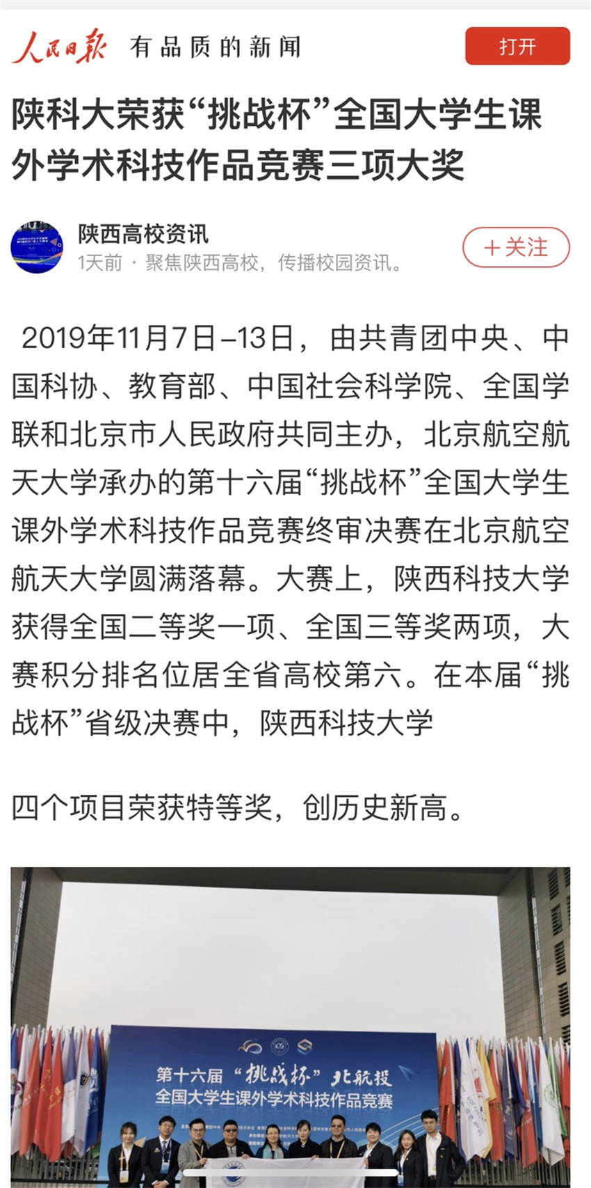 人民日報APP:陜科大榮獲“挑戰(zhàn)杯”全國大學生課外學術(shù)科技作品競賽三項大獎