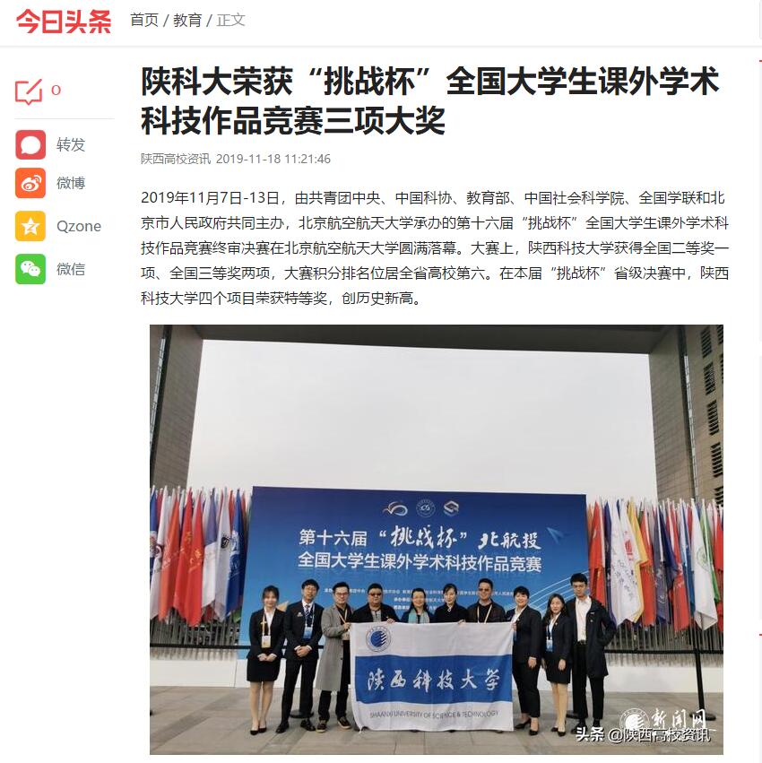 今日頭條APP:陜科大榮獲“挑戰(zhàn)杯”全國大學生課外學術(shù)科技作品競賽三項大獎