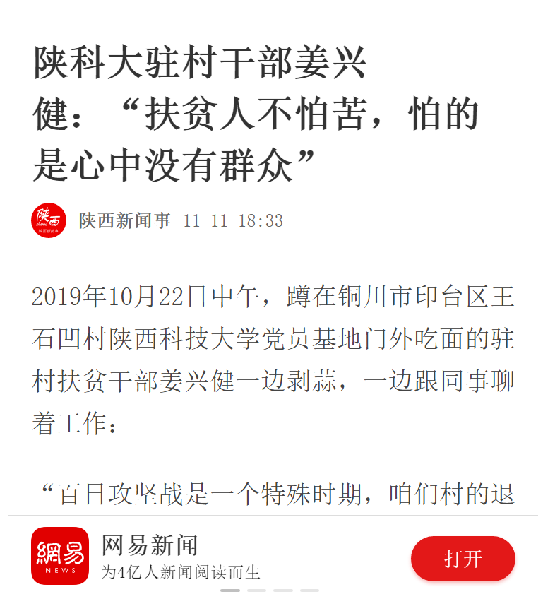 網易新聞:陜科大駐村干部姜興?。骸胺鲐毴瞬慌驴?,怕的是心中沒有群眾”