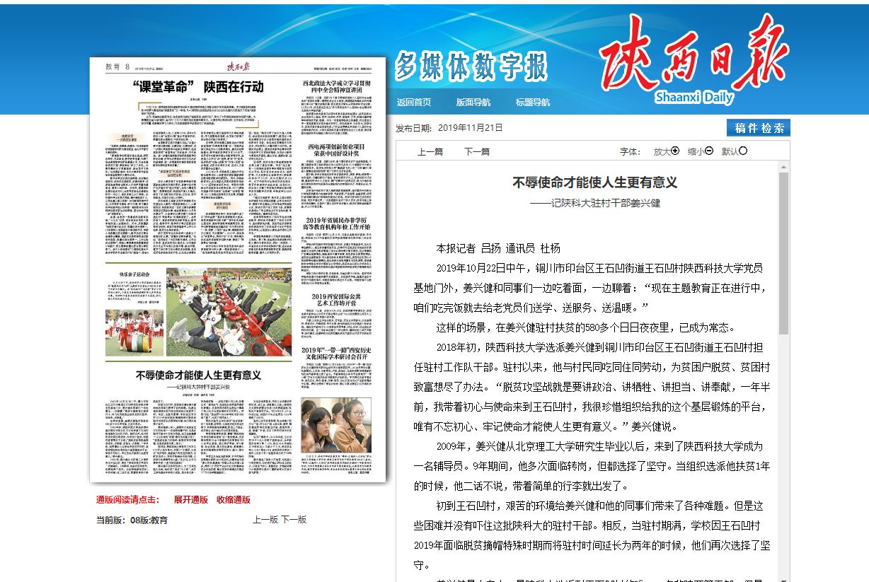 11月21日,《陜西日報》以不辱使命才能使人生更有意義--記陜科大駐村干部姜興健為題,報道了我校駐村干部姜興健駐村扶貧事跡,鏈接如下:陜西日報:不辱使命才能使人生更有意義——記陜科大駐村干部姜興健