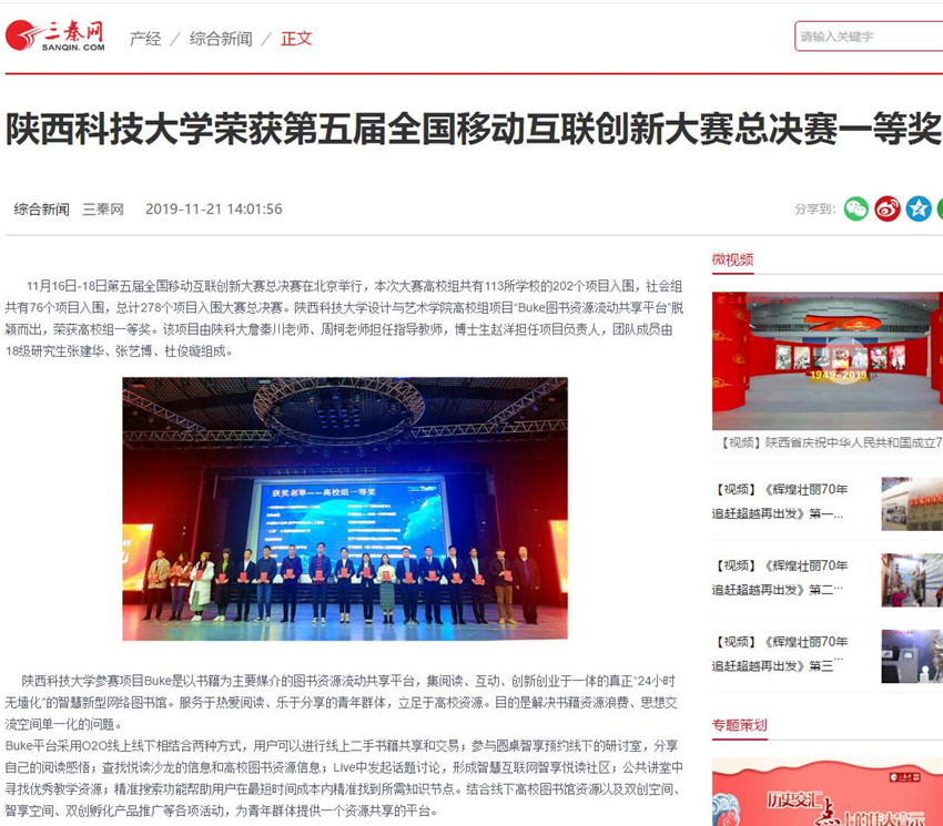 三秦網(wǎng)報道:陜西科技大學(xué)榮獲第五屆全國移動互聯(lián)創(chuàng)新大賽總決賽一等獎