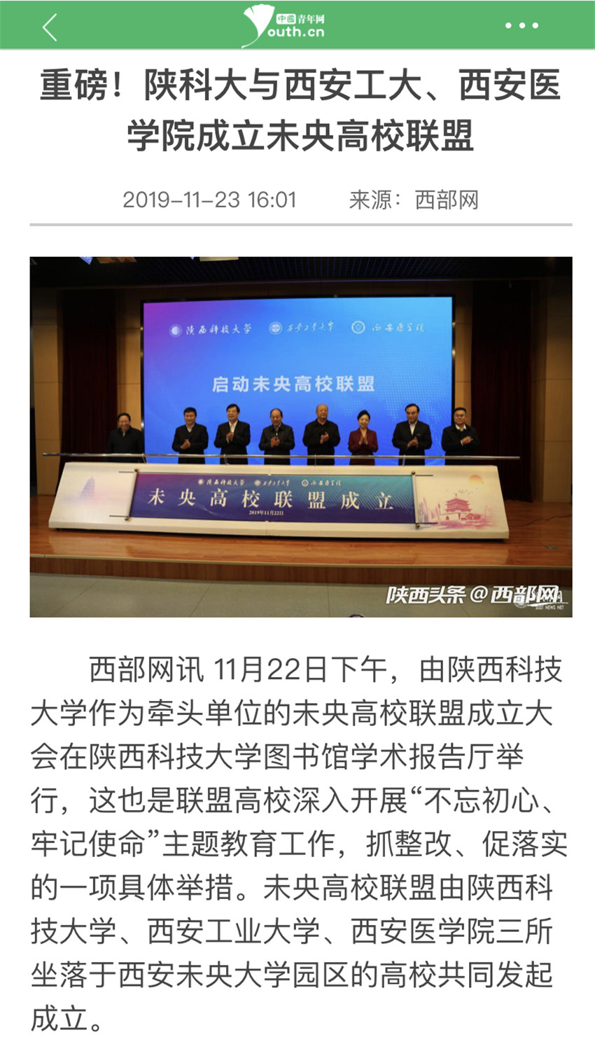 近日,中國(guó)青年網(wǎng)、中國(guó)教育網(wǎng)、搜狐網(wǎng)、今日頭條、百度APP、網(wǎng)易新聞、三秦網(wǎng)、陜西傳媒網(wǎng)等媒體紛紛報(bào)道我校與西安工大、西安醫(yī)學(xué)院成立未央高校聯(lián)盟。