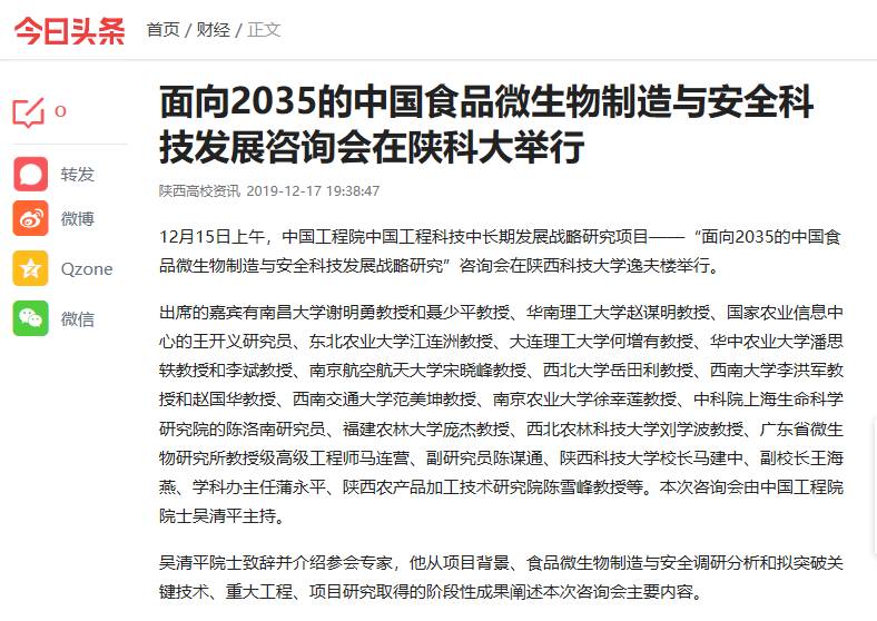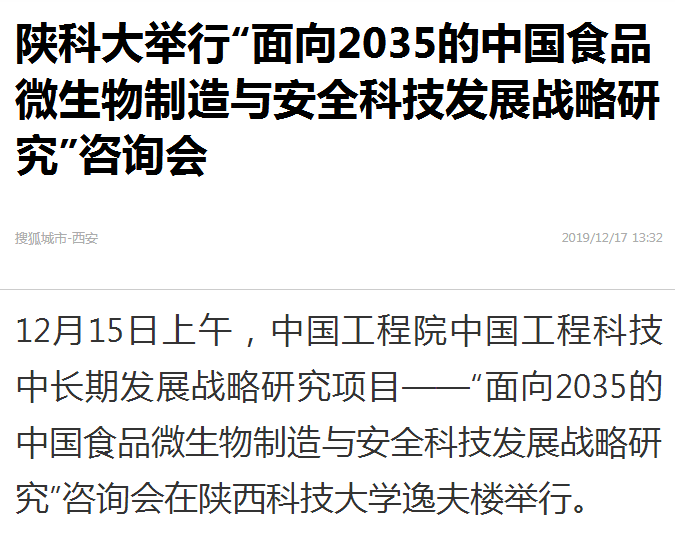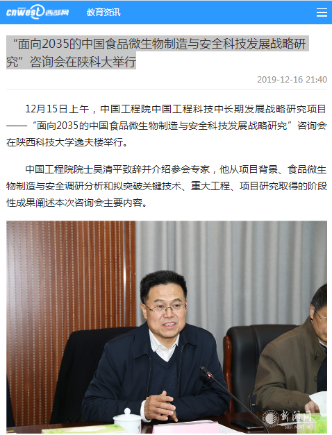 近日,中國(guó)教育網(wǎng)、西部網(wǎng)、今日頭條等媒體紛紛報(bào)道面向2035的中國(guó)食品微生物制造與安全科技發(fā)展戰(zhàn)略研究”咨詢會(huì)在陜西科技大學(xué)舉行。