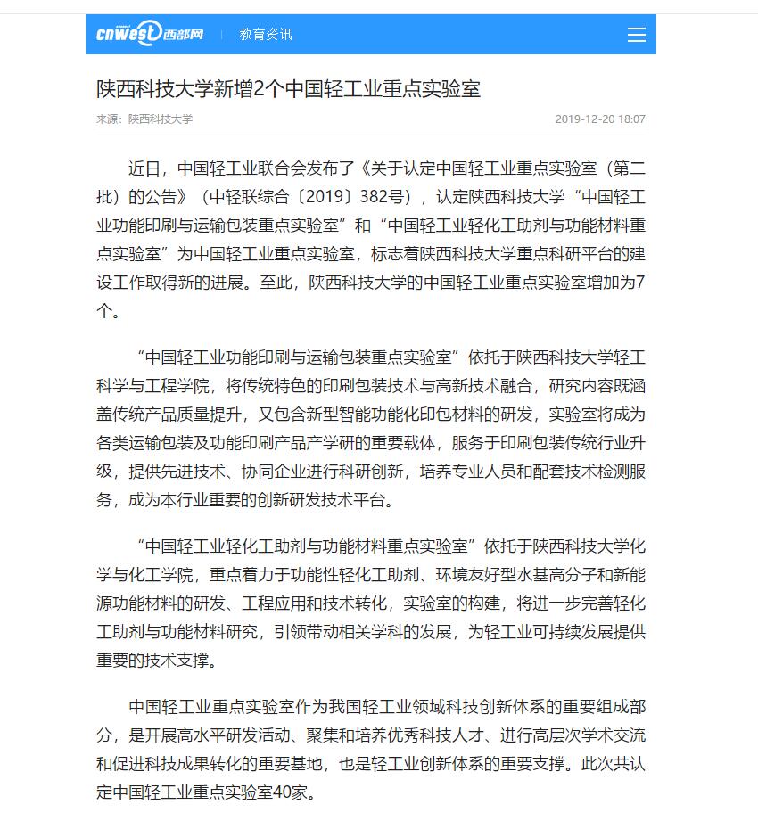 西部網(wǎng):陜西科技大學(xué)新增2個中國輕工業(yè)重點實驗室