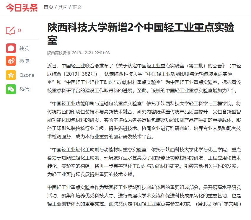 今日頭條APP:陜西科技大學(xué)新增2個中國輕工業(yè)重點實驗室