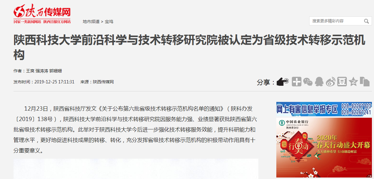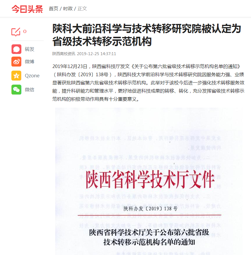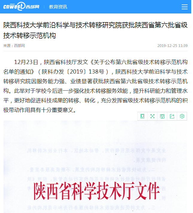 今日頭條:陜科大前沿科學與技術轉移研究院被認定為省級技術轉移示范機構