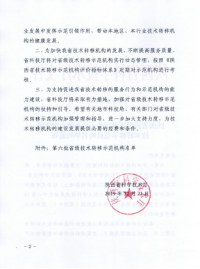 2019年12月23日,陜西省科技廳發(fā)文《關于公布第六批省級技術轉移示范機構名單的通知》(陜科辦發(fā)〔2019〕138號),陜西科技大學前沿科學與技術轉移研究院因服務能力強、業(yè)績顯著獲批陜西省第六批省級技術轉移示范機構。此舉對于該校今后進一步強化技術轉移服務效能,提升科研能力和管理水平,更好地促進科技成果的轉移、轉化,充分發(fā)揮省級技術轉移示范機構的積極帶動作用具有十分重要意義。