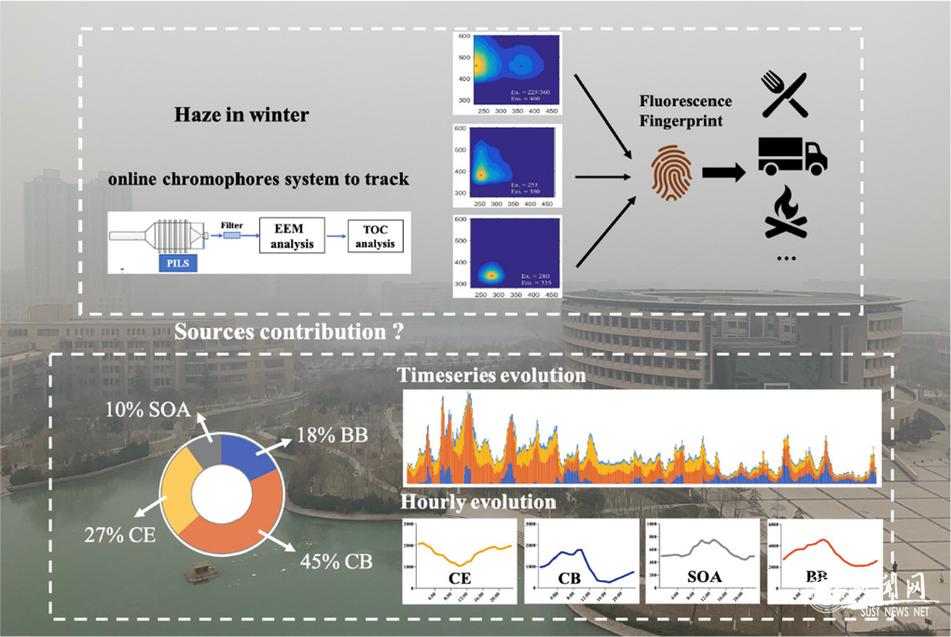 該課題研究歷時(shí)三年,得到了國家自然科學(xué)基金項(xiàng)目(41703102、41877354),陜西科技大學(xué)“青年拔尖”啟動經(jīng)費(fèi)等資金支持。主要分為兩方面的工作:一是技術(shù)方面,開發(fā)了基于熒光指紋示蹤的大氣PM2.5化學(xué)組分分析、大氣化學(xué)反應(yīng)機(jī)制探討、大氣污染來源鑒定的技術(shù)方法;二是設(shè)備方面,實(shí)現(xiàn)了大氣PM2.5在線捕獲系統(tǒng)(PILS)與三維熒光光譜(EEM)、總有機(jī)碳分析儀(TOC)的串聯(lián)并用。綜合以上兩方面的技術(shù)和硬件平臺,最終實(shí)現(xiàn)了大氣污染物在線監(jiān)測和來源解析的功能,獲得數(shù)據(jù)可應(yīng)用于精確了解大氣污染物的起源、揭示污染產(chǎn)生和消失機(jī)制,最終服務(wù)區(qū)域大氣污染的治理。團(tuán)隊(duì)以陜科大大氣監(jiān)測站點(diǎn)為中心,利用該監(jiān)測設(shè)備已相繼開展了“冬季霧霾形成過程與成因解析”“春季沙塵暴發(fā)生觀測與空氣質(zhì)量影響分析”“夏季大氣污染物化學(xué)反應(yīng)機(jī)制”等具體研究。