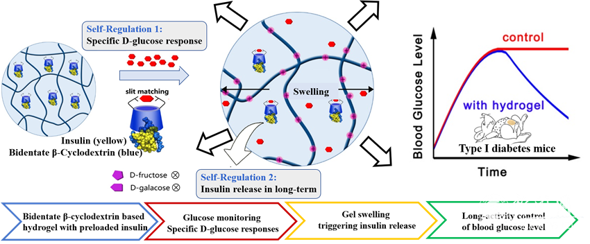 人體內(nèi)葡萄糖分子與其同分異構(gòu)體結(jié)構(gòu)極其相似。人工合成具有高度專一性地識別葡萄糖分子的模擬酶分子難度較大,已報道的少數(shù)分子幾乎都存在合成過程復(fù)雜等問題。最近,我校輕工科學(xué)與工程學(xué)院陳詠梅教授與食品與生物工程學(xué)院王任其副教授團隊研究利用β-環(huán)糊精空腔直徑與葡萄糖分子尺寸相匹配這一特點,精妙設(shè)計合成了二齒-β-環(huán)糊精,進而制備了基于二齒-β-環(huán)糊精的新型水凝膠體系。該二齒-β-環(huán)糊精可專一性地與D-葡萄糖分子結(jié)合并釋放質(zhì)子,造成水凝膠體積溶脹,從而促使水凝膠中預(yù)載的胰島素快速釋放到血液環(huán)境中。此新型水凝膠在I型糖尿病小鼠體內(nèi)快速響應(yīng)高血糖癥并釋放胰島素,可實現(xiàn)12小時內(nèi)長效控制血糖水平。