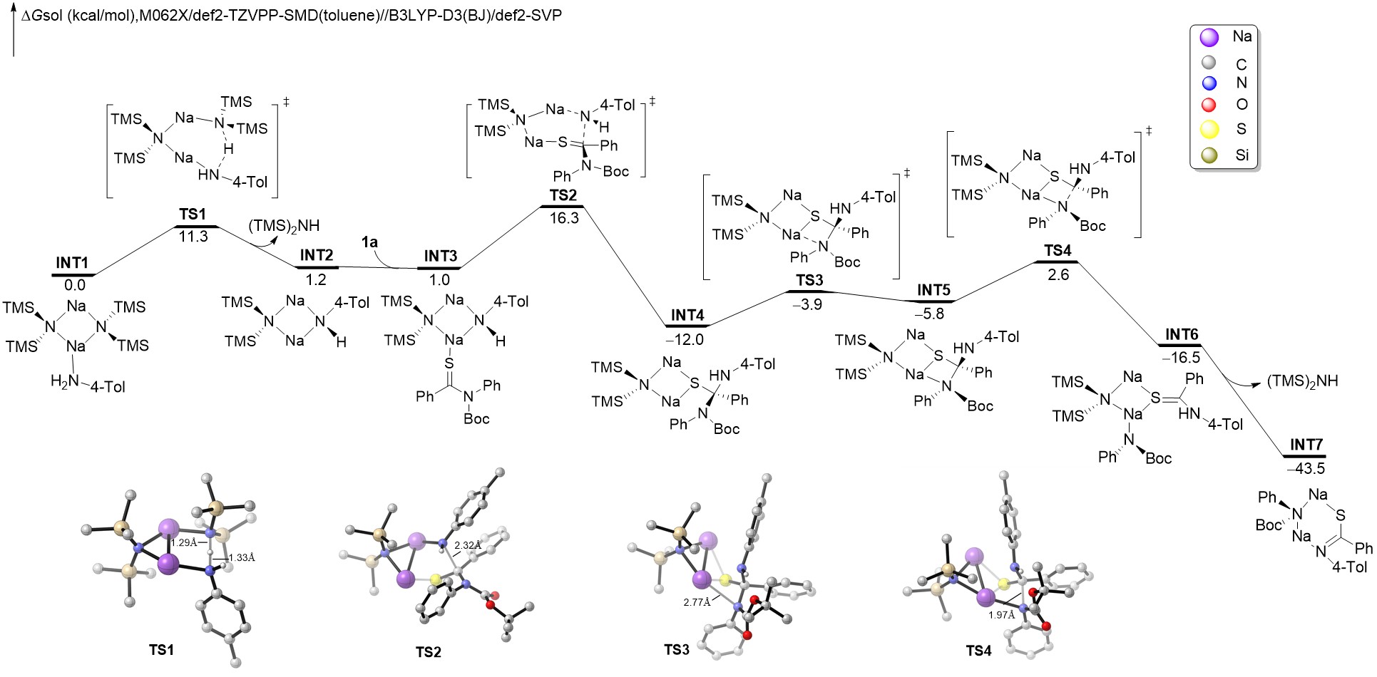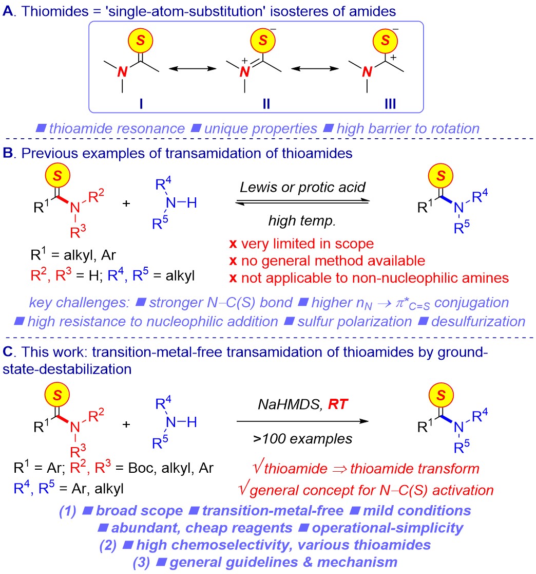 “Chemoselective Transamidation of Thioamides by Transition-Metal-Free N–C(S) Transacylation”首次提出了硫代酰胺的“基態(tài)去穩(wěn)定化”(ground-state-destabilization)策略,實現(xiàn)了在藥學(xué)、生物學(xué)領(lǐng)域有著廣泛應(yīng)用的硫代酰胺的轉(zhuǎn)胺化反應(yīng)。該方法不僅避免了毒性過渡金屬催化劑的使用,而且有著廣泛的底物適用范圍(>100個底物)。為了進(jìn)一步厘清硫代酰胺轉(zhuǎn)胺化的反應(yīng)機理,該論文還通過密度泛函理論對反應(yīng)過程進(jìn)行了探討。
