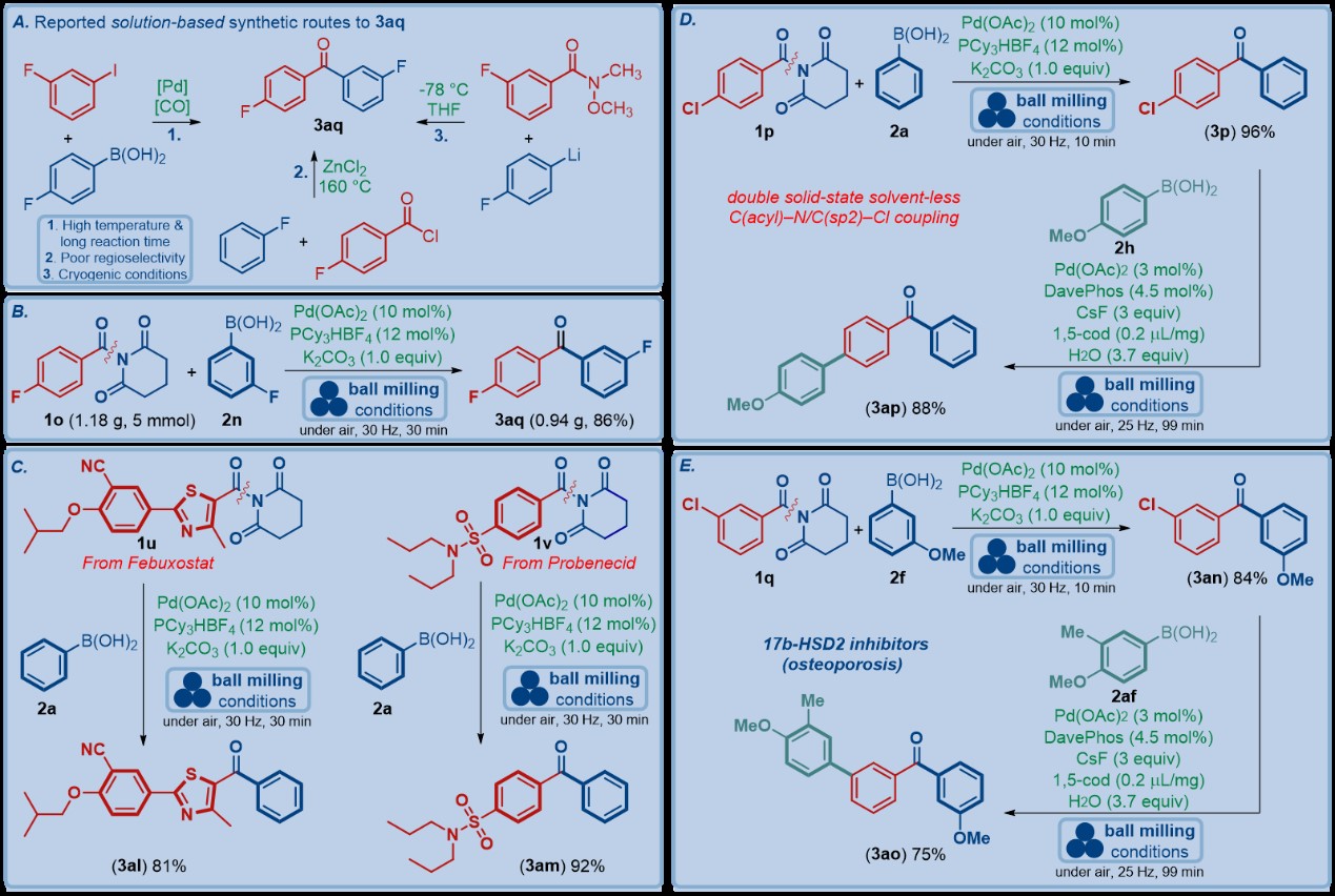 “Mechanochemical Solvent-Free Suzuki–Miyaura Cross-Coupling of Amides via Highly Chemoselective N–C Cleavage首次將機械化學(xué)方法應(yīng)用于碳氮鍵選擇性斷裂的Suzuki-Miyaura交叉偶聯(lián)反應(yīng)。反應(yīng)過程不需要任何有機溶劑與額外加熱,后處理簡單,反應(yīng)高效,并可用于醫(yī)藥中間體的合成、復(fù)雜藥物的后期修飾與機械化學(xué)條件下的串聯(lián)偶聯(lián)反應(yīng)。本研究不僅豐富了酰胺鍵的活化反應(yīng)研究,而且為有機合成化學(xué)中惰性化學(xué)鍵的活化反應(yīng)提供了新思路。