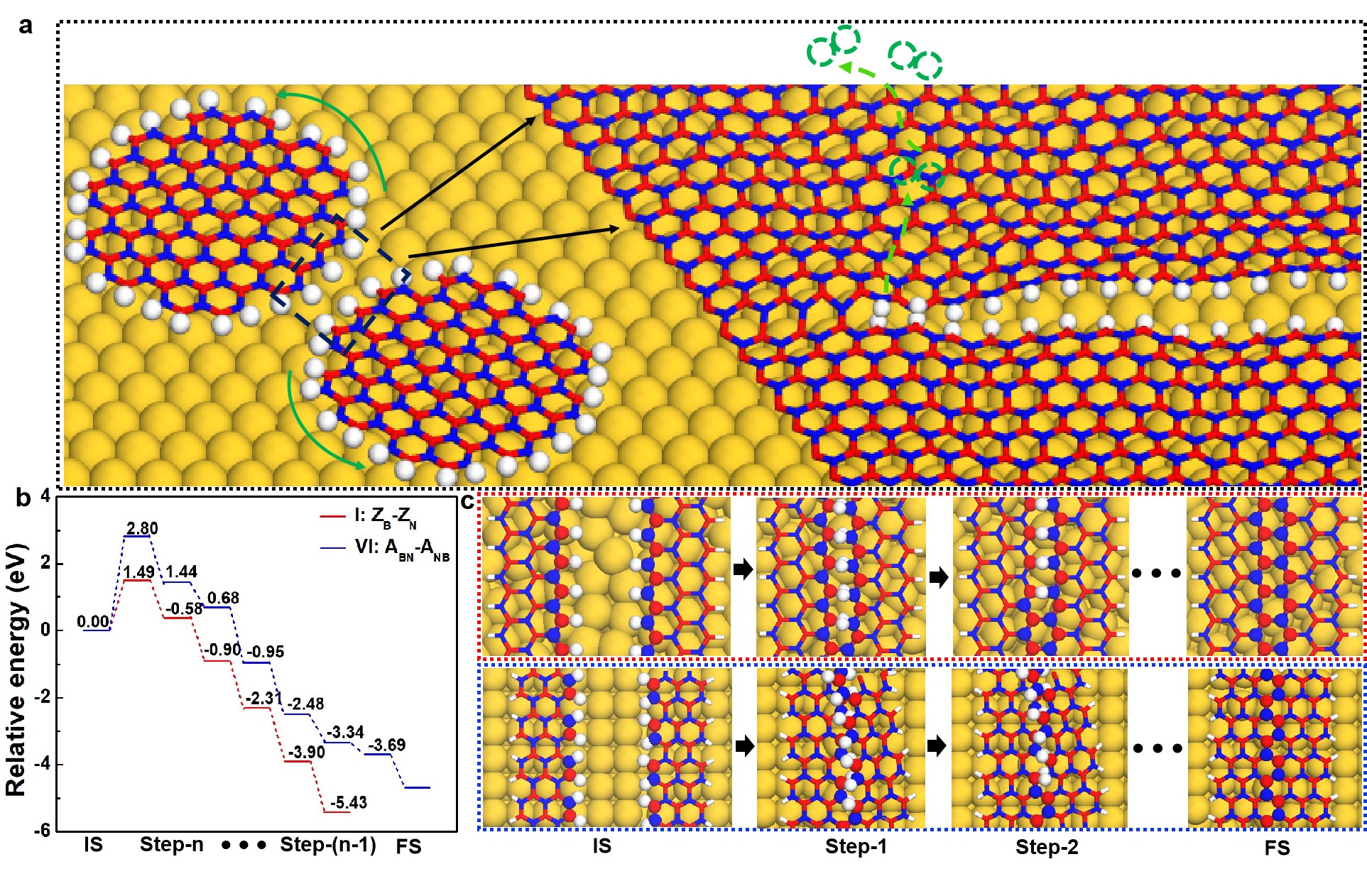 成果1:針對(duì)在液態(tài)基底上,不同邊界的二維晶疇能否通過(guò)無(wú)縫融合實(shí)現(xiàn)晶圓級(jí)單晶生長(zhǎng)這一至今尚不清楚的科學(xué)問(wèn)題。電智學(xué)院丁利蘋副教授與韓國(guó)蔚山基礎(chǔ)科學(xué)研究院丁峰教授合作在“ACS Nano 2022, 15, 19387”上發(fā)表題為“Mechanism of 2D Materials Seamless-Coalescences on Liquid Substrate”的論文。以六方氮化硼(hBN)在液態(tài)金表面的生長(zhǎng)為例,系統(tǒng)研究了不同邊界的hBN晶疇無(wú)縫融合過(guò)程。從靜態(tài)計(jì)算到分子動(dòng)力學(xué)模擬,全面探究大尺寸、高質(zhì)量晶圓級(jí)hBN單晶生長(zhǎng)的微觀機(jī)理。丁利蘋副教授為論文第一作者,我校文理學(xué)院邵鵬副教授為論文第二作者。