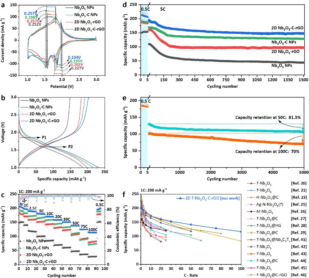 電動(dòng)汽車(chē)(EV)的快速發(fā)展是當(dāng)下地面交通運(yùn)輸領(lǐng)域變革的最顯著標(biāo)志。然而,人們?cè)谌胧蛛妱?dòng)汽車(chē)時(shí),優(yōu)先考慮的是其“續(xù)航里程”“充電效率”和“功率輸出”,而作為電動(dòng)汽車(chē)的“心臟”,鋰離子電池的性能無(wú)疑是影響電動(dòng)汽車(chē)上述特性的最重要因素之一。為此,景盼盼博士等人基于晶格氧空位和2D層狀結(jié)構(gòu),開(kāi)發(fā)了具有超高倍率特性(a capacity of 114 mAh/g obtained at 100 C or 20 A/g)和超長(zhǎng)循環(huán)穩(wěn)定性(a capacity of 147 mAh/g obtained at 5C for 1,500 cycles and 107 mAh/g obtained at 50 C for 5,000 cycles)的T-Nb2O5-Carbon-Graphene鋰離子電池負(fù)極材料,并揭示了T-Nb2O5的晶格氧空位能夠有效提升整個(gè)復(fù)合材料的電子電導(dǎo)和鋰離子的擴(kuò)散動(dòng)力學(xué)特性。此研究工作是景盼盼博士在美國(guó)佐治亞理工學(xué)院留學(xué)期間與Prof. Meilin Liu(Hightower Endowed Chair and Regents' Professor,H-index:135)和Dr. Bote Zhao(現(xiàn)為華南理工大學(xué)教授)共同合作完成。