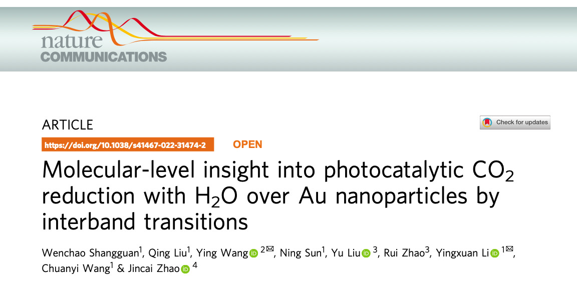 Wenchao Shangguan, Qing Liu, Ying Wang, Ning Sun, Yu Liu, Rui Zhao, Yingxuan Li, Chuanyi Wang, Jincai Zhao. Molecular-level insight into photocatalytic CO2 reduction with H2O over Au nanoparticles by interband transitions.Nat. Commun.2022, 13, 3894.https://www.nature.com/articles/s41467-022-31474-2