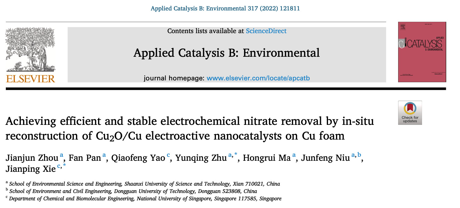 Jianjun Zhou, Fan Pan, Qiaofeng Yao, Yunqing Zhu*, Hongrui Ma, Junfeng Niu, Jianping Xie. Achieving efficient and stable electrochemical nitrate removal by in-situ reconstruction of Cu2O/Cu electroactive nanocatalysts on Cu foam,Applied Catalysis B: Environmental, 2022, 121811.
