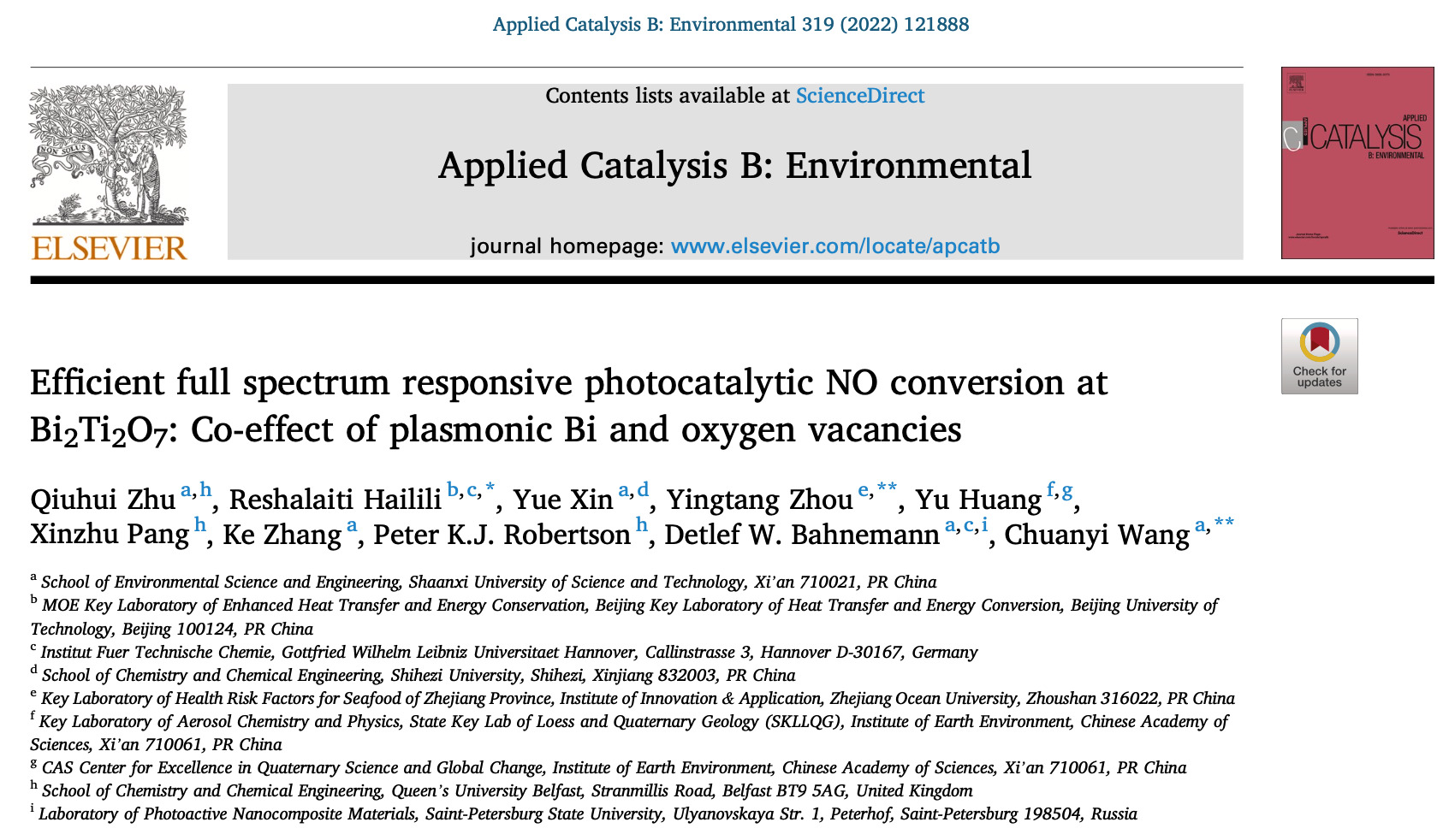 Qiuhui Zhu, Reshalaiti Hailili, Yue Xin, Yingtang Zhou, Yu Huang, Xinzhu Pang, Ke Zhang, Peter K.J. Robertson, Detlef W. Bahnemann, Chuanyi Wang. Efficient Full Spectrum Responsive Photocatalytic NO Conversion at Bi2Ti2O7: Co-Effect of Plasmonic Bi and Oxygen Vacancy,Applied Catalysis B: Environmental, 2022, 319, 121888.