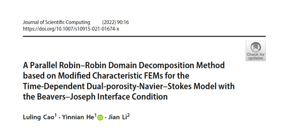 [3] Luling Cao, Yinnian He, Jian Li, A Parallel Robin-Robin Domain Decomposition Method based on Modified Characteristic FEMs for the Time-Dependent Dual-porosity-Navier-Stokes Model with the Beavers-Joseph Interface Condition,Journal of Scientific Computing, 90 (2022): 1-34.