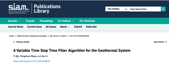 [1] Yi Qin, Yongshuai Wang, Jian Li, A Variable Time Step Time Filter Algorithm for the Geothermal System.SIAM Journal on Numerical Analysis, 60(2022): 2781-2806.