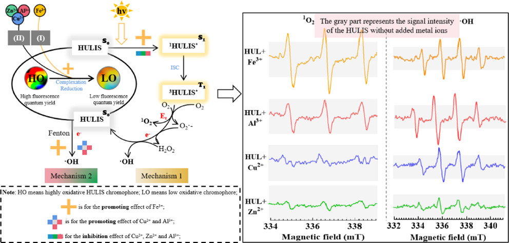 研究指出大氣PM2.5不僅影響人民身體健康,還會(huì)影響全球或區(qū)域性氣候。該項(xiàng)研究發(fā)現(xiàn)西安地區(qū)大氣PM2.5中含有豐富的溫室成分—類(lèi)腐殖質(zhì)物質(zhì)(HULIS),它在各種微量組分金屬離子(特別是Fe3+離子)的脅迫下可以發(fā)生顯著的光學(xué)特性變化,不僅增強(qiáng)大氣PM2.5對(duì)氣候的增溫效應(yīng),還發(fā)現(xiàn)大氣PM2.5的光化學(xué)反應(yīng)活性也明顯增強(qiáng)了(包括激活三線(xiàn)態(tài)、活性氧自由基反應(yīng)),進(jìn)而影響區(qū)域空氣質(zhì)量。最后,作者圍繞這些發(fā)現(xiàn)提出了分子交互和自由基反應(yīng)機(jī)制,以及潛在的領(lǐng)域影響。